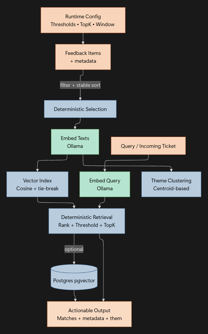 The diagram below shows the controlled flow from runtime configuration and domain data, through embeddings as the semantic layer, and into deterministic retrieval, thresholding, and clustering (with an optional pgvector scale-out path).